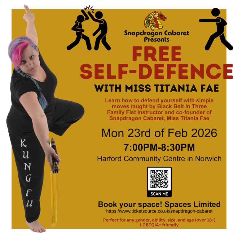 In a safe environment learn how to defend yourself with simple moves taught by Black Belt in Three Family Fist instructor and co-founder of Snapdragon Cabaret, Miss Titania Fae. Do not want to miss!