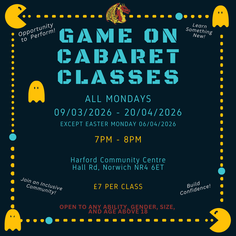 Starting Monday, the 9th of March 2026 from 7:00PM - 8:00PM at the Harford Community Centre in Norwich, you will learn in 6 classes a bit of a routine and basic burlesque techniques. You could either come just to learn some techniques, have fun, and/or if you feel confident when it gets closer you could have the opportunity to perform in the group routine in front of a large audience at our Game On! video game themed Cabaret show on Saturday 25th of April 2026 at Voodoo Daddy's Showroom in Norwich.
